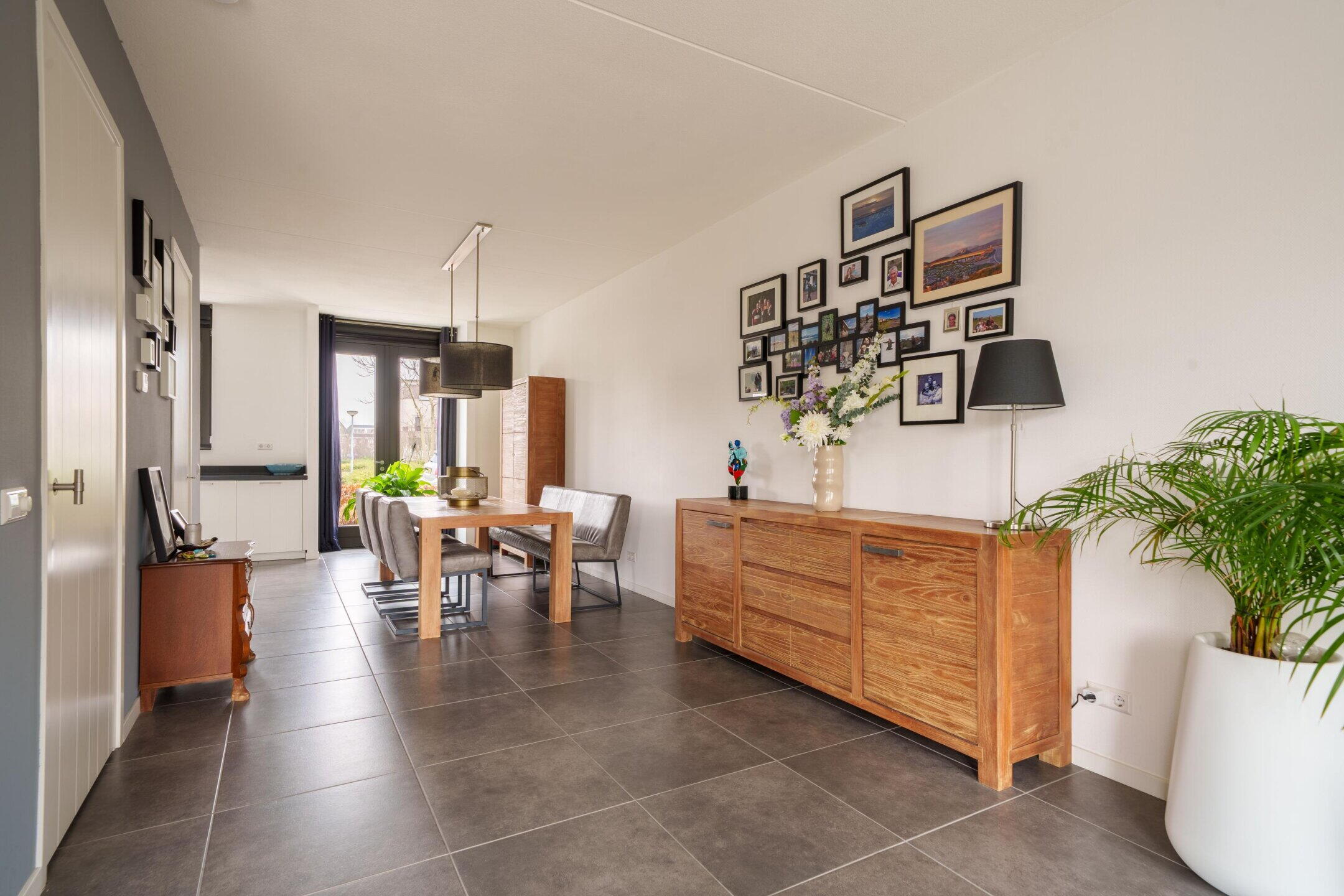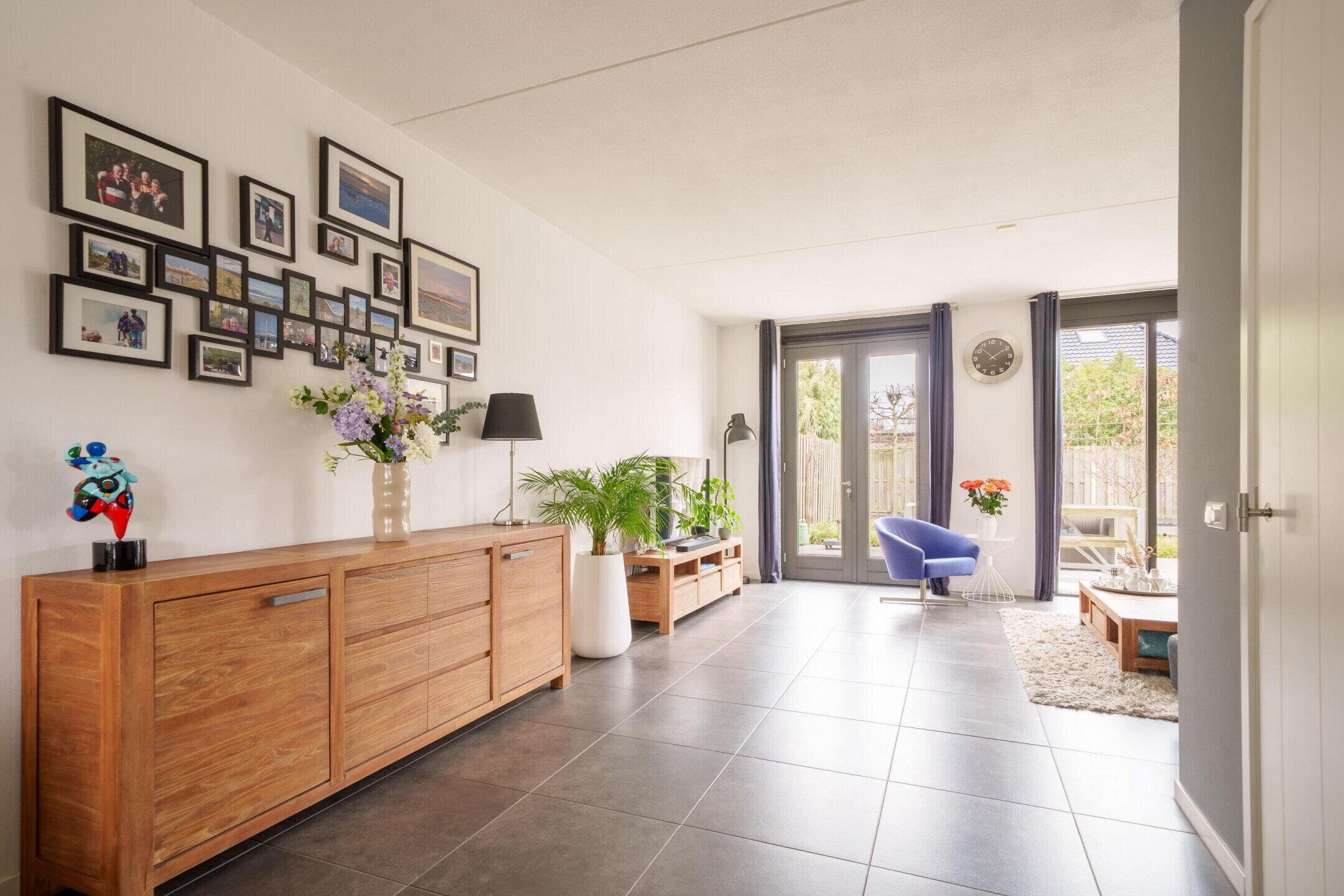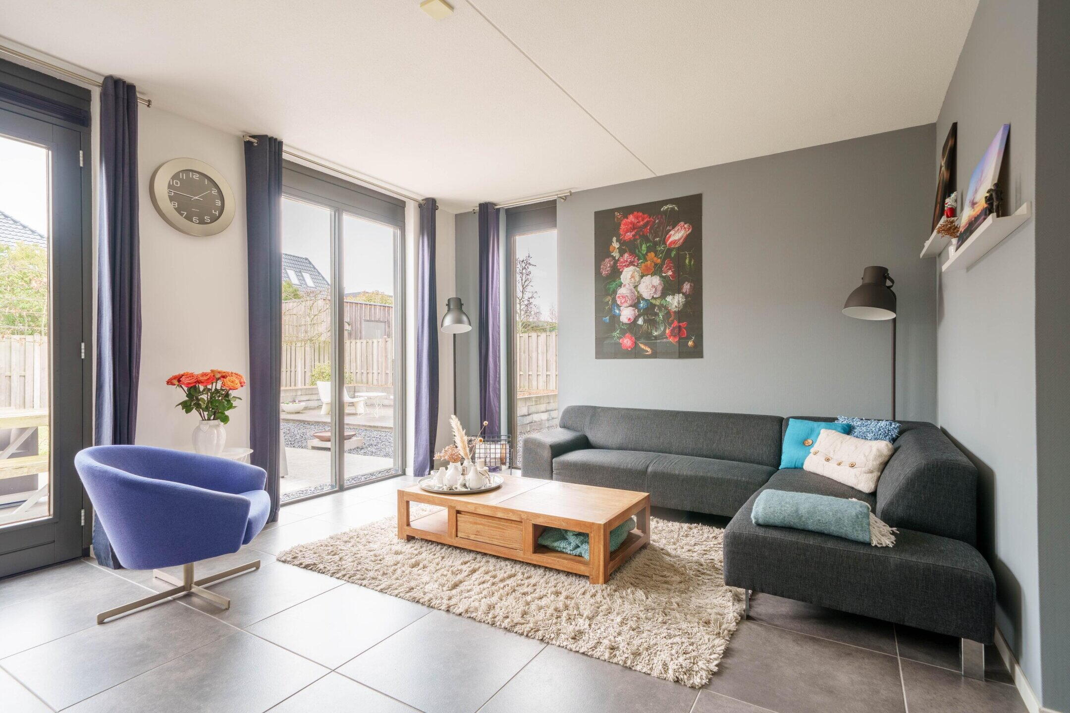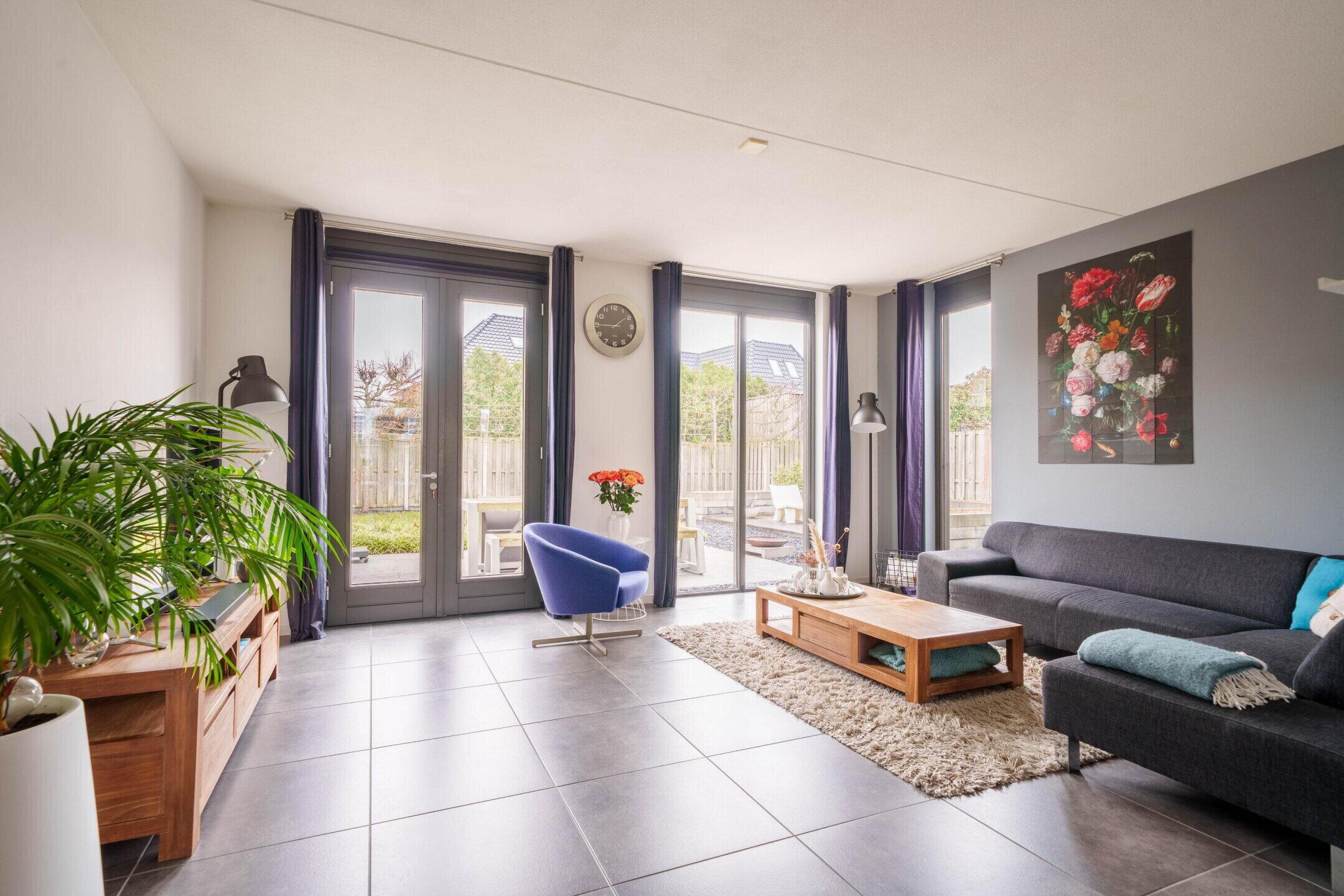 • Tuingerichte woonkamer met hoge ramen en dubbele openslaande deuren