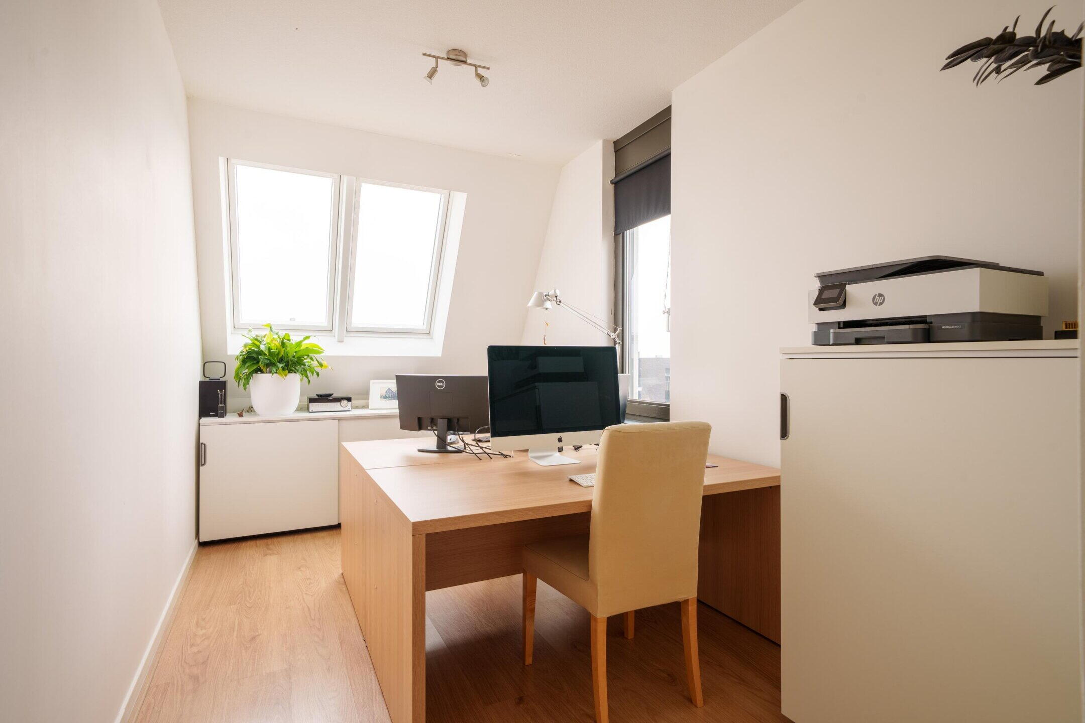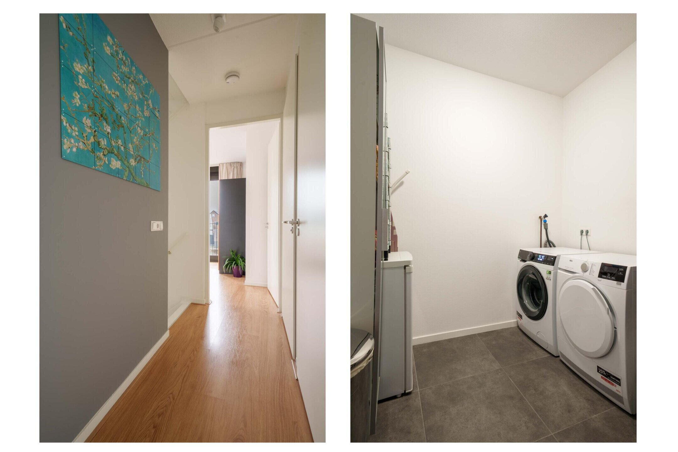 Ruime overloop met 2 slaapkamers, badkamer, aparte toiletruimte én wasruimte. De masterbedroom aan de achterzijde loopt over de volledige breedte van de woning en beschikt over 2 Franse balkons. De slaapkamer aan de voorzijde heeft ook een Frans balkon. De badkamer is voorzien van een royaal ligbad, een inloopdouche en een wastafelmeubel met spiegelverlichting. Alle slaapkamers zijn afgewerkt met glad gestuukte wanden en laminaatvloeren.