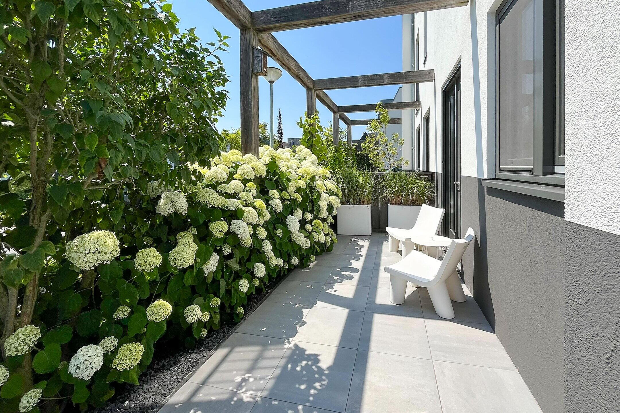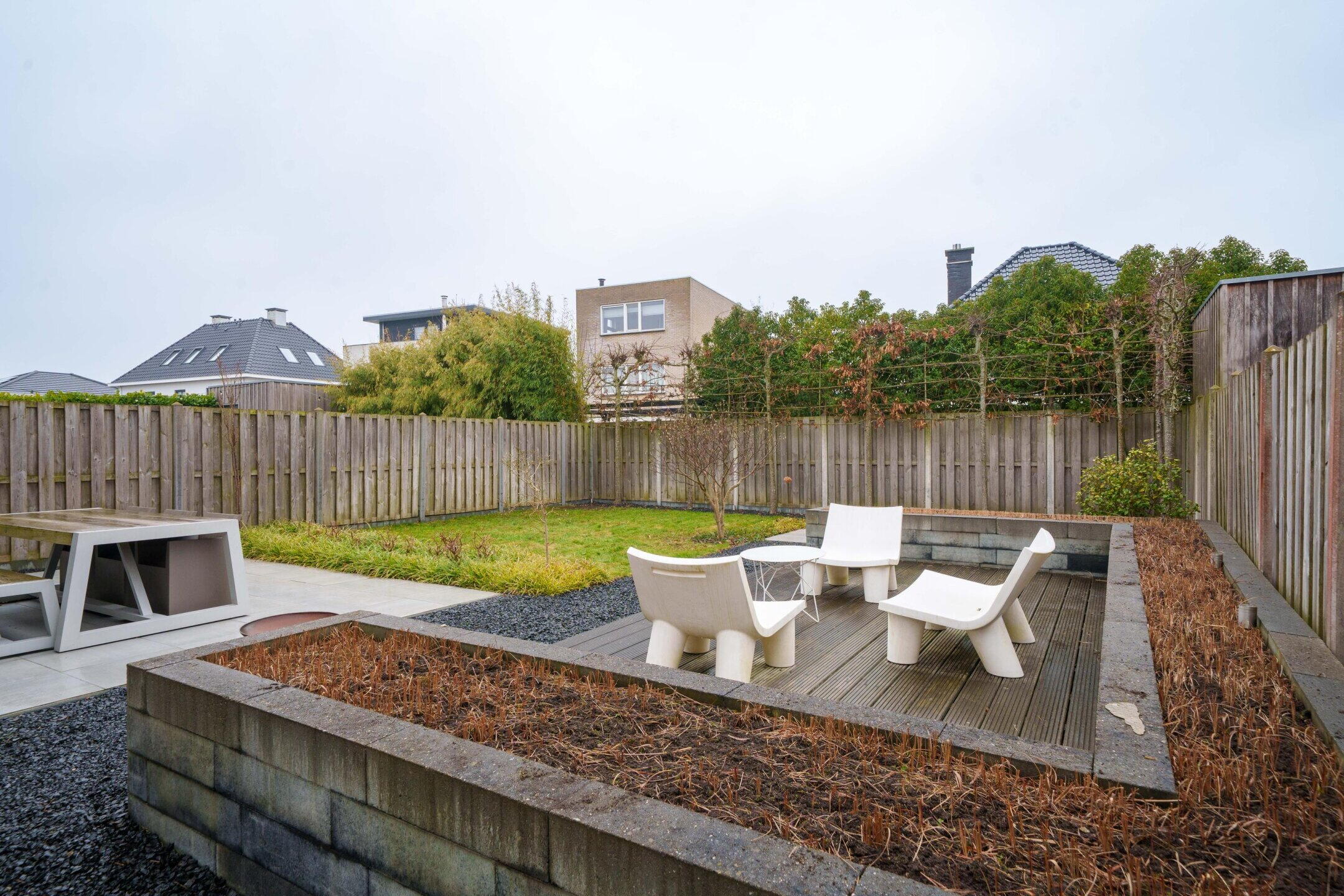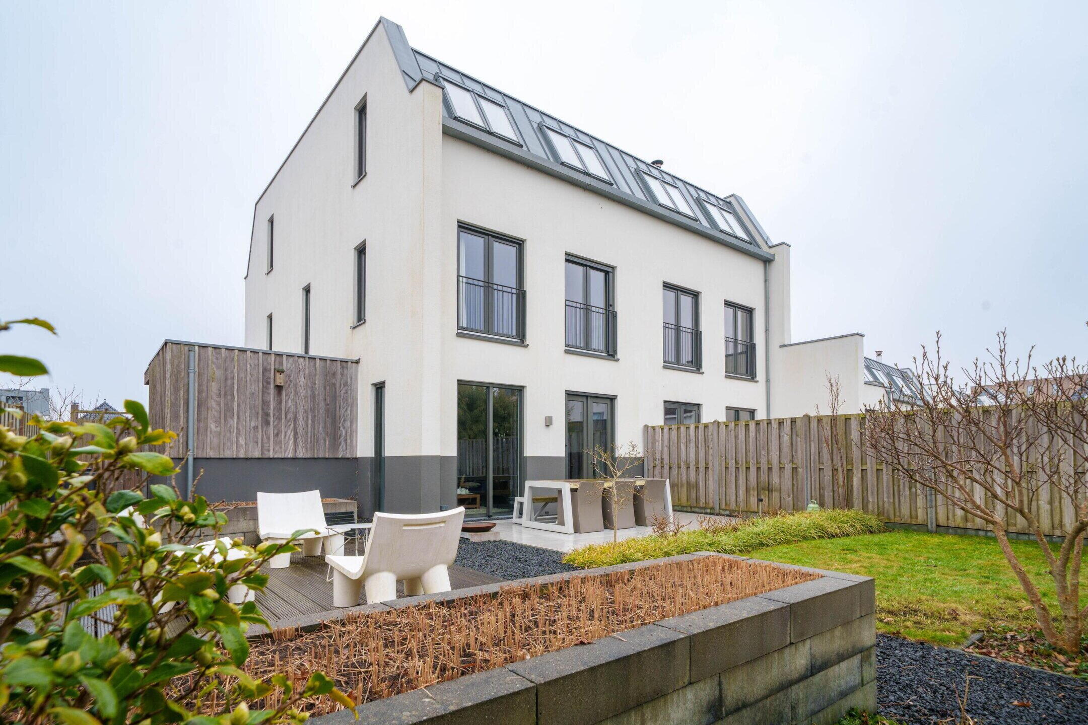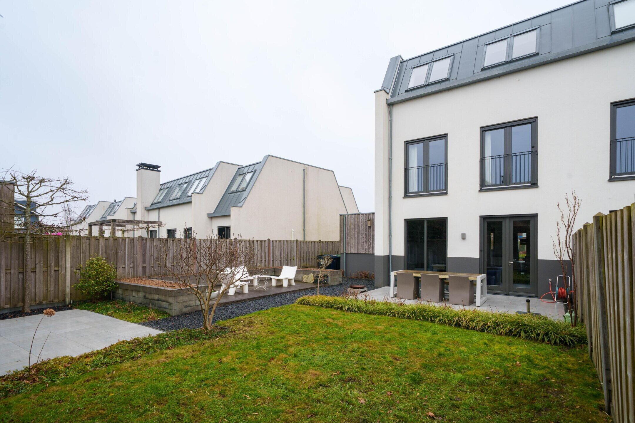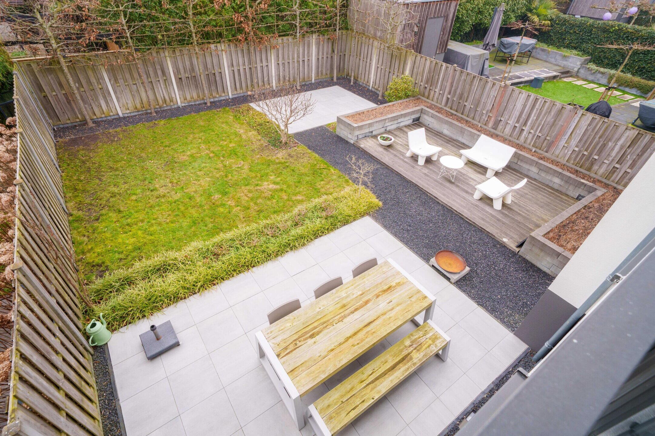 • Zeer ruime achtertuin (ca. 150 m²) op het noordwesten met 3 terrassen, sierbestrating, gazon en veel privacy door hoge leibomen