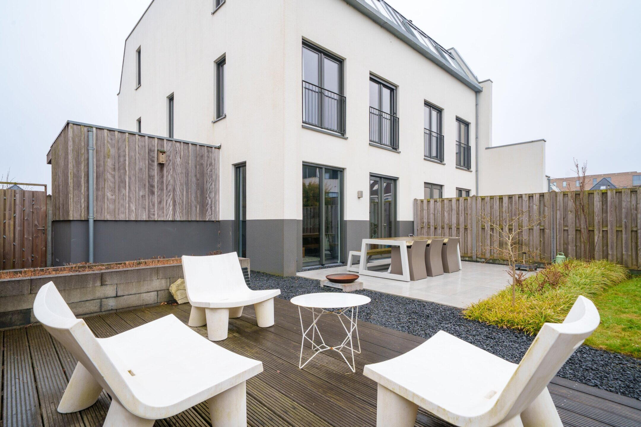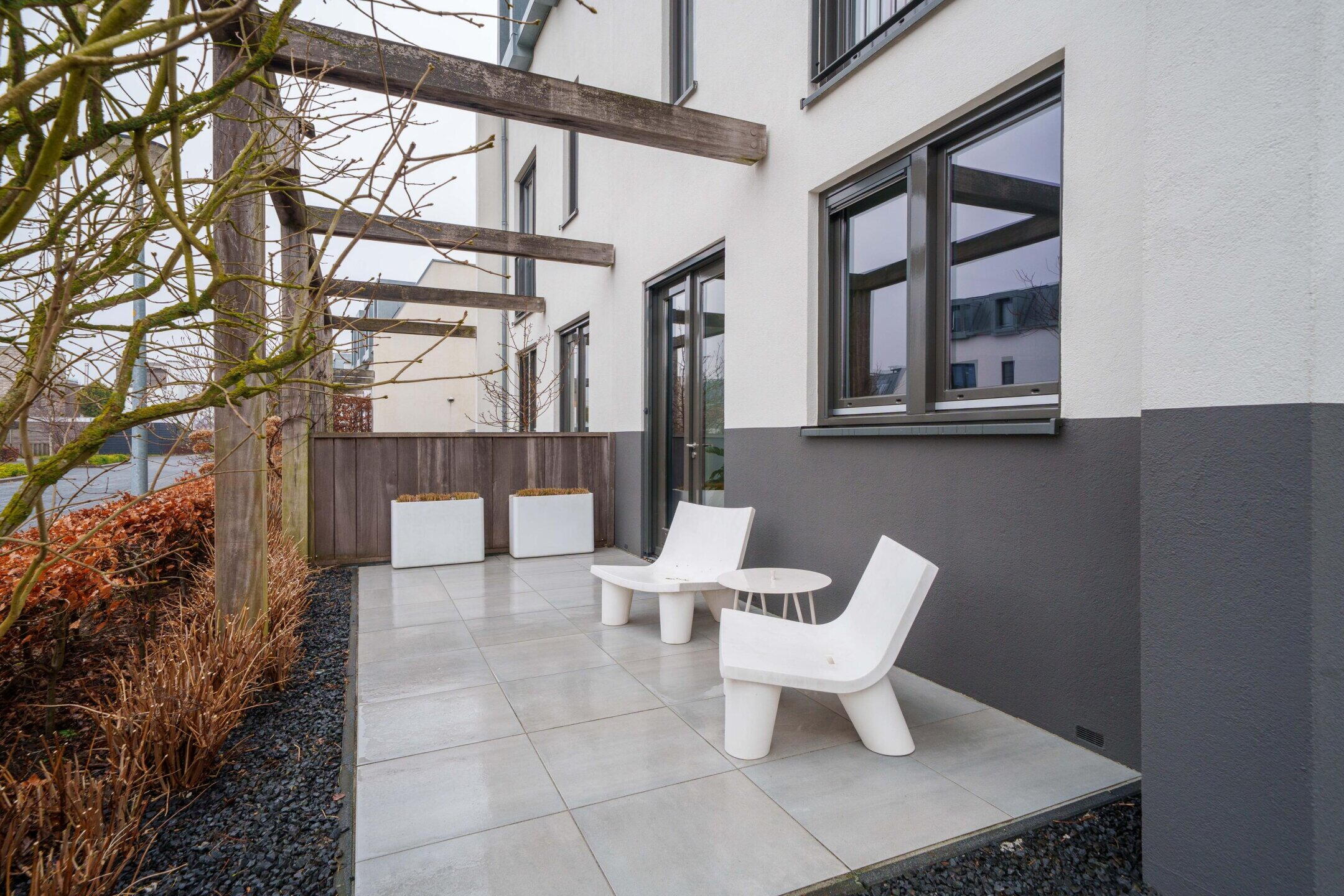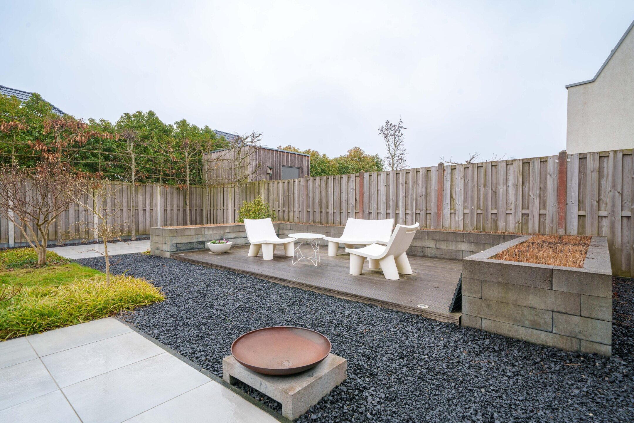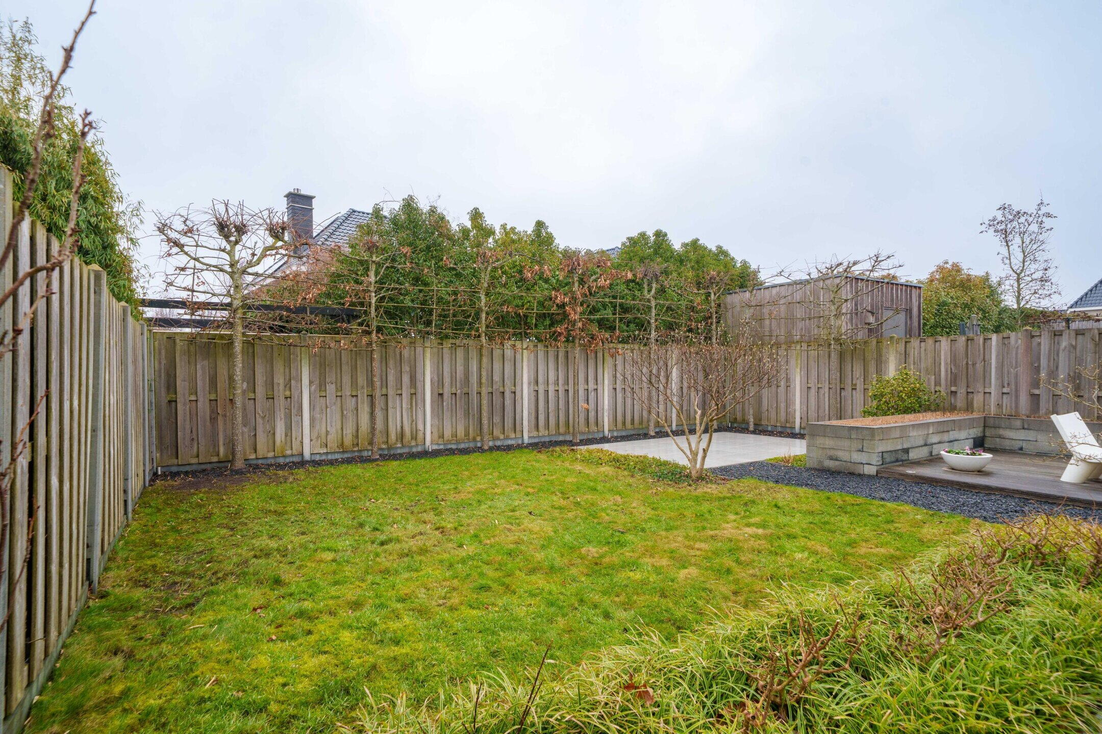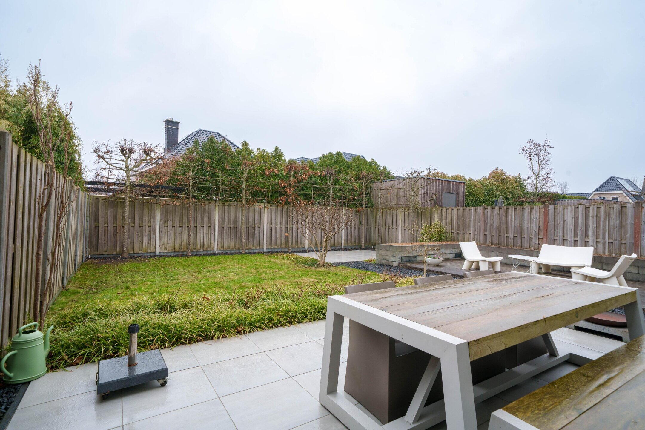 • Zeer ruime achtertuin (ca. 150 m²) op het noordwesten met 3 terrassen, sierbestrating, gazon en veel privacy door hoge leibomen