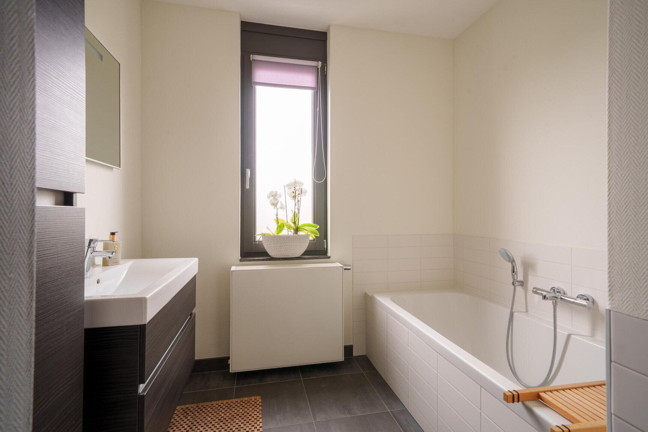 • Moderne badkamer met ligbad, royale inloopdouche en wastafelmeubel