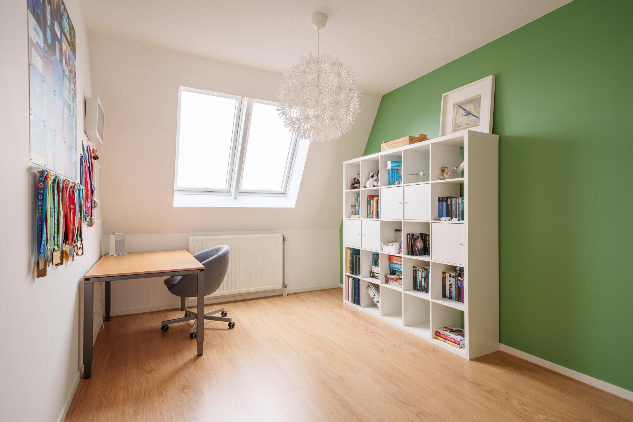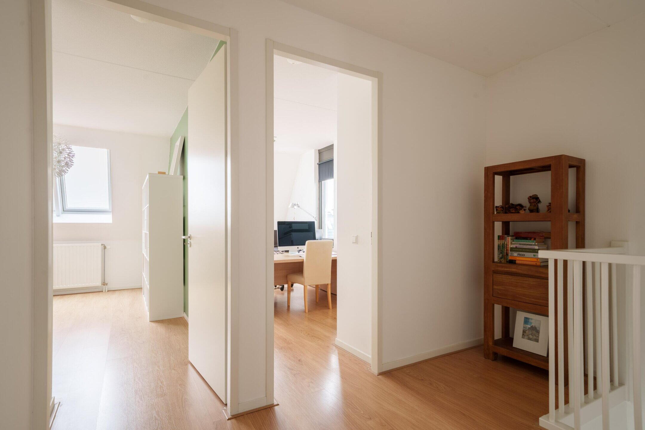 Overloop met berging en drie zeer ruime slaapkamers, waaronder de voorzijde over de gehele breedte van de woning. Ideaal voor werk-, hobby- of logeerkamers.