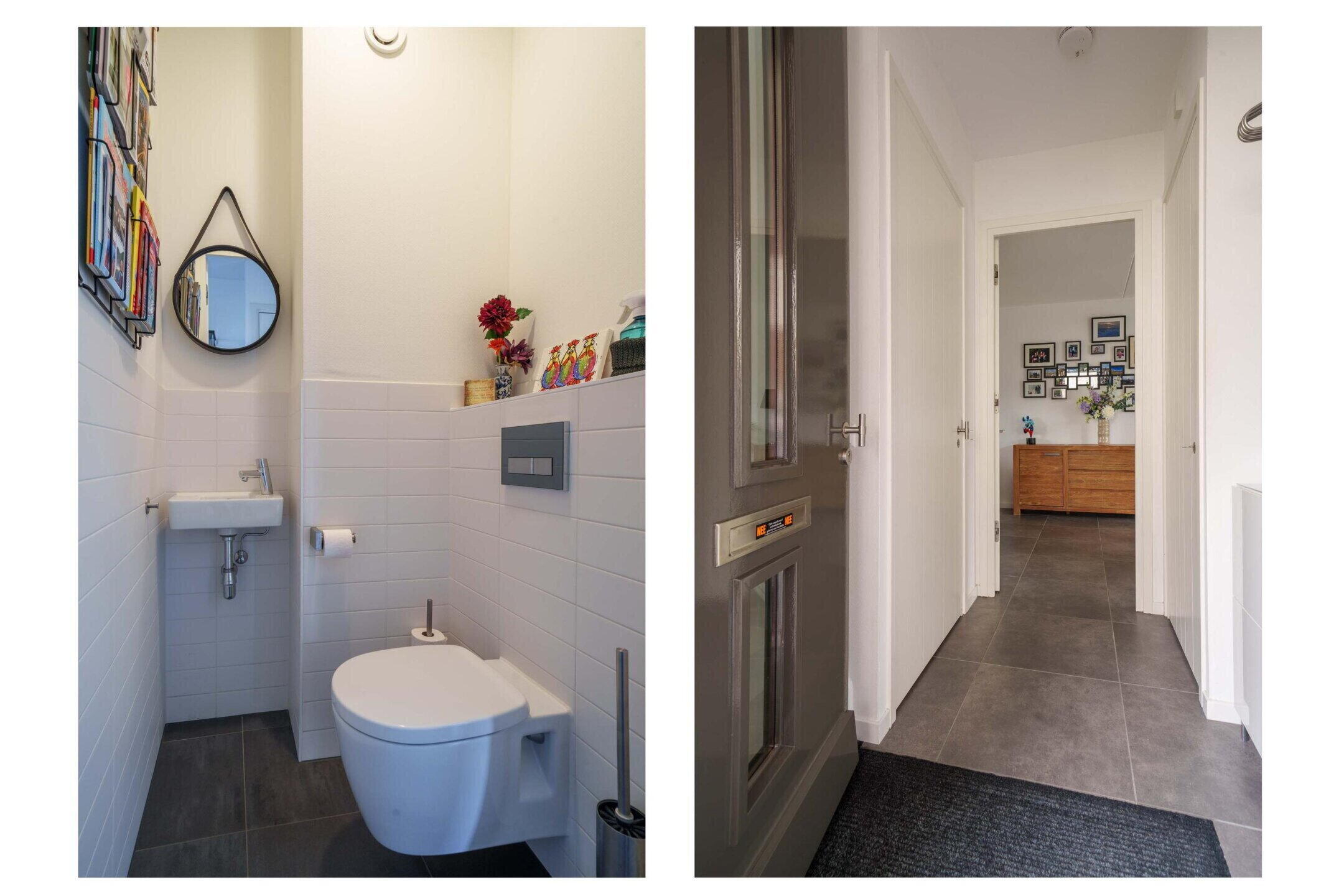 Via de entreehal bereikt u het toilet (zwevend closet en fonteintje), de meterkast en de tuingerichte woonkamer. De royale woonkamer heeft hoge plafonds en veel daglicht door de grote ramen en dubbele openslaande deuren naar de achtertuin. De aan de voorzijde gelegen keuken biedt voldoende ruimte voor de eethoek en is uitgevoerd met een luxe, U-vormige keuken welke is voorzien van alle wenselijke Siemens-apparatuur waaronder een koelkast, vriezer, oven, combimagnetron, vaatwasser, inductiekookplaat en een afzuigschouw met eigen afvoer. Ook hier veel daglicht en een dubbele deur naar de voortuin. Hier bevindt zich tevens een handige bergkast. De vloer is voorzien van plavuizen met vloerverwarming en de wanden zijn afgewerkt met glasvezelbehang. Via de trap in de entreehal bereikt u de verdiepingen.
